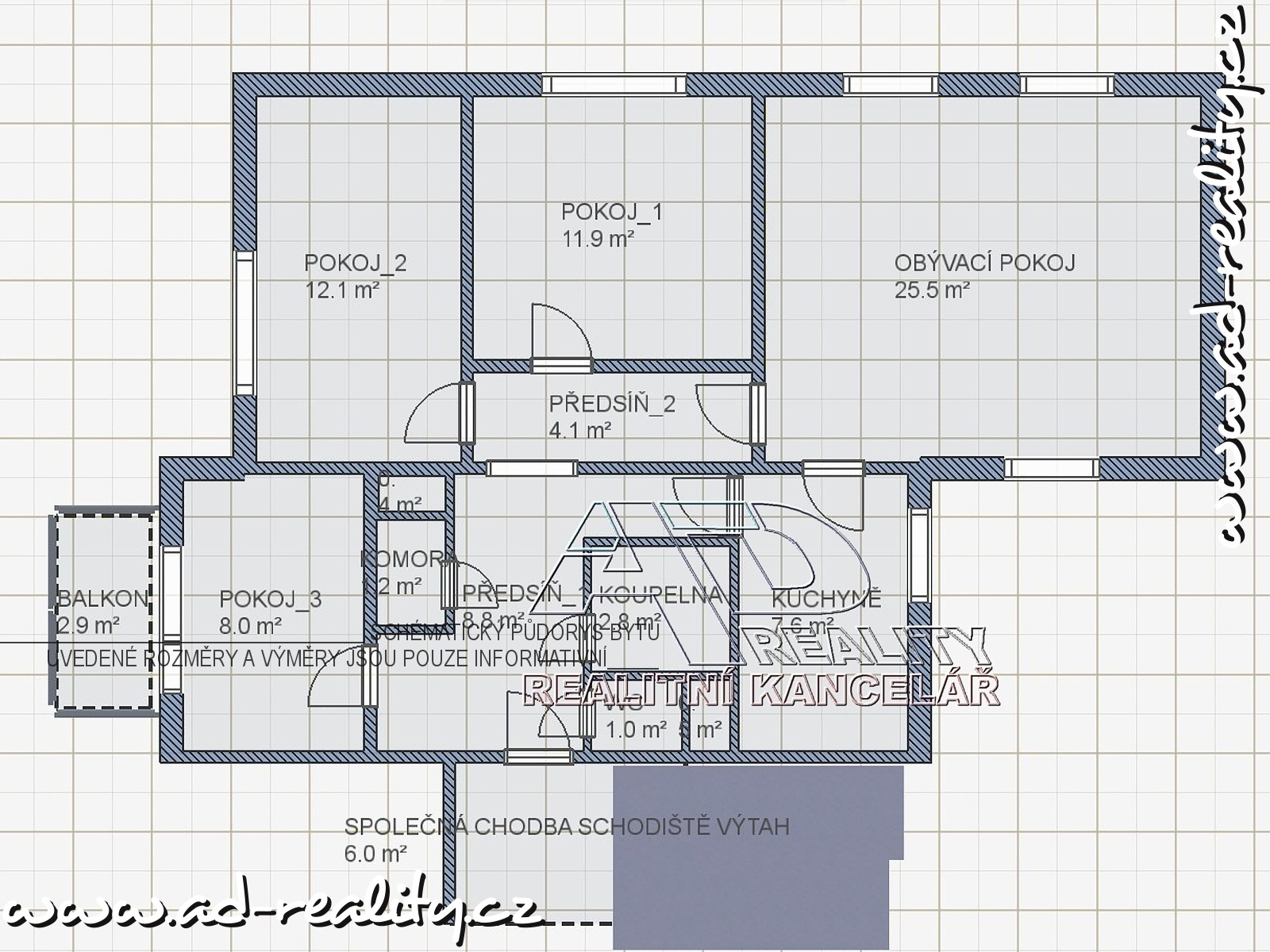 Celková plocha bytu 90m2, podlahová plocha bytu [84,6m2] + balkon [2,3m2] + větší sklep [3,0m2].